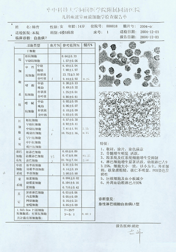 楊青血液細(xì)胞學(xué)檢查報告單(圖)