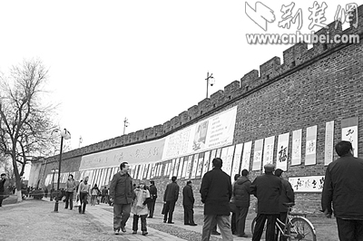 荊楚網(wǎng)(楚天都市報(bào))(記者釋喻 攝)前日上午,襄樊西門橋古城墻上舉辦了一場(chǎng)別開(kāi)生面的書(shū)法展,近百幅作品被懸掛在城墻上,向市民免費(fèi)展出,展覽為期7天。此次活動(dòng)由襄樊市文聯(lián)等單位舉辦,展出的是書(shū)法家王樹(shù)人先生的遺作和其傳人的近期作品。活動(dòng)現(xiàn)場(chǎng)還進(jìn)行了書(shū)法義賣,所得款項(xiàng)將用于襄樊歷史文化名城的保護(hù)和宣傳工作。