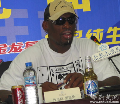在記者會上,曾和喬丹、皮蓬一起被稱為“公牛鐵三角”、七屆NBA籃板的丹尼斯.羅德曼格外引人注目,記者圍繞著一些球迷感興趣的話題對他進行了采訪。當(dāng)有人問起他為什么在見面會上會這么平靜時,他的回答幽默又讓人充滿期待:這里有這么多的攝影機、照相機和記者朋友,施展不開,當(dāng)然要平靜。賽場上的我和此時的我完全不同,想看一個真正的羅德曼,明天去賽場吧。