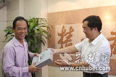 來自赤壁的幸運(yùn)讀者接受江總編輯頒發(fā)的獎(jiǎng)品,這位龍先生非常高興,他說他的手機(jī)正好該換了,沒想到運(yùn)氣這么好得到一部這么好的手機(jī)。