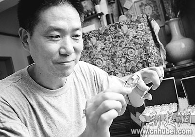 慢功出細(xì)活。童洪斌在半粒米大小的象牙片上創(chuàng)作的大熊貓,在去年舉行的武漢市國際文化產(chǎn)業(yè)博洽會上,作為禮物送給外國友人。