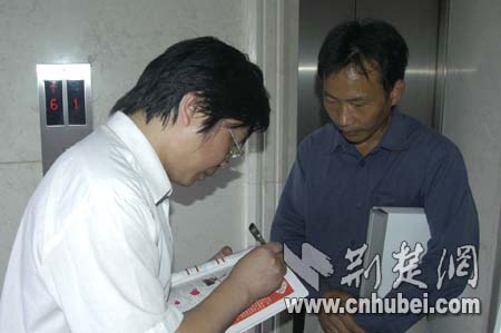 荊楚網副總編輯黃斌應潛江萬先生之請簽名留戀,萬先生表示要將這份紀念帶回去