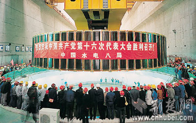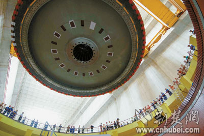 今年8月1日,三峽左岸電廠的最后一臺發(fā)電機(jī)組轉(zhuǎn)子吊入機(jī)坑(圖二)。令三峽建設(shè)者們感到自豪的是,這同樣是世界上最大的發(fā)電機(jī)組,不同的是其零部件國產(chǎn)化程度達(dá)到85%。
