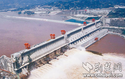 三峽工程建筑由大壩、水電站廠房和通航建筑物三大部分組成。大壩為混凝土重力壩,壩軸線全長2309.47米,壩頂高程185米,最大壩高181米。設(shè)有23個(gè)泄洪深孔,最大泄洪能力可達(dá)102500立方米/秒。電站壩段位于大壩兩側(cè),共裝機(jī)26臺,單機(jī)額定容量70萬千瓦的水輪發(fā)電機(jī)組,總裝機(jī)容量為1820萬千瓦,年發(fā)電量847億千瓦時(shí)。通航建筑物包括永久船閘和升船機(jī)。永久船閘為雙線五級連續(xù)梯級船閘。單級閘室可通過萬噸級船隊(duì)。