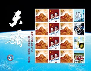 這套反映神六主題的個性化郵票為8枚版式個性化郵票,每版的副票圖案,有4張為航天員費俊龍與聶海勝的兩人合影,其他4張圖案分別為出征、運行、細胞實驗、勝利歸來,主票圖案為長城。