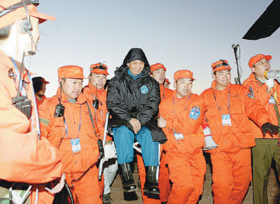 費(fèi)俊龍、聶海勝隔著舷窗,在向人們招手———返回艙內(nèi)柔和的燈光,映著他們的微笑。這一刻,距他們離開(kāi)大地4天又19個(gè)多小時(shí),他們的總行程為325萬(wàn)余公里。