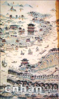 此圖藏于大連市圖書(shū)館,手繪彩圖。未標(biāo)明作者姓名和成圖時(shí)間,圖中標(biāo)注了武昌、漢口“龍王廟”等。筆者鑒定此圖為清代中期作品,根據(jù)是圖中有“龍王廟”,而龍王齋建于乾隆四年(1739年),故此圖當(dāng)于1739年以后所繪。但圖中沒(méi)有出現(xiàn)漢口城堡,而漢口城堡建于1864年,同時(shí)圖中只繪有木帆船,而未出現(xiàn)現(xiàn)近代輪船。武漢江面出現(xiàn)航運(yùn)和輪船是1862年以后。可知,此圖當(dāng)成于1862年前。可大體界定此圖繪于1739年至1862年之間。