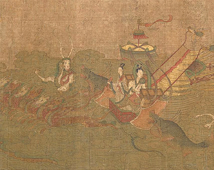 此圖是根據(jù)三國(220--265年)魏人曹植所寫《洛神賦》而創(chuàng)作的故事畫。畫面開首描繪曹植在洛水河邊與洛水女神瞬間相逢的情景,曹植步履趨前,遠(yuǎn)望龍鴻飛舞,一位“肩若削成,腰如約素”、“云髻峨峨,修眉聯(lián)娟”的洛水女神飄飄而來,而又時(shí)隱時(shí)現(xiàn),忽往忽來。后段畫洛神駕六龍?jiān)栖囯x去,玉鸞、文魚、鯨鯢等相伴左右,洛神回首張望,依依不舍,一種無奈離析之情顯現(xiàn)畫面。