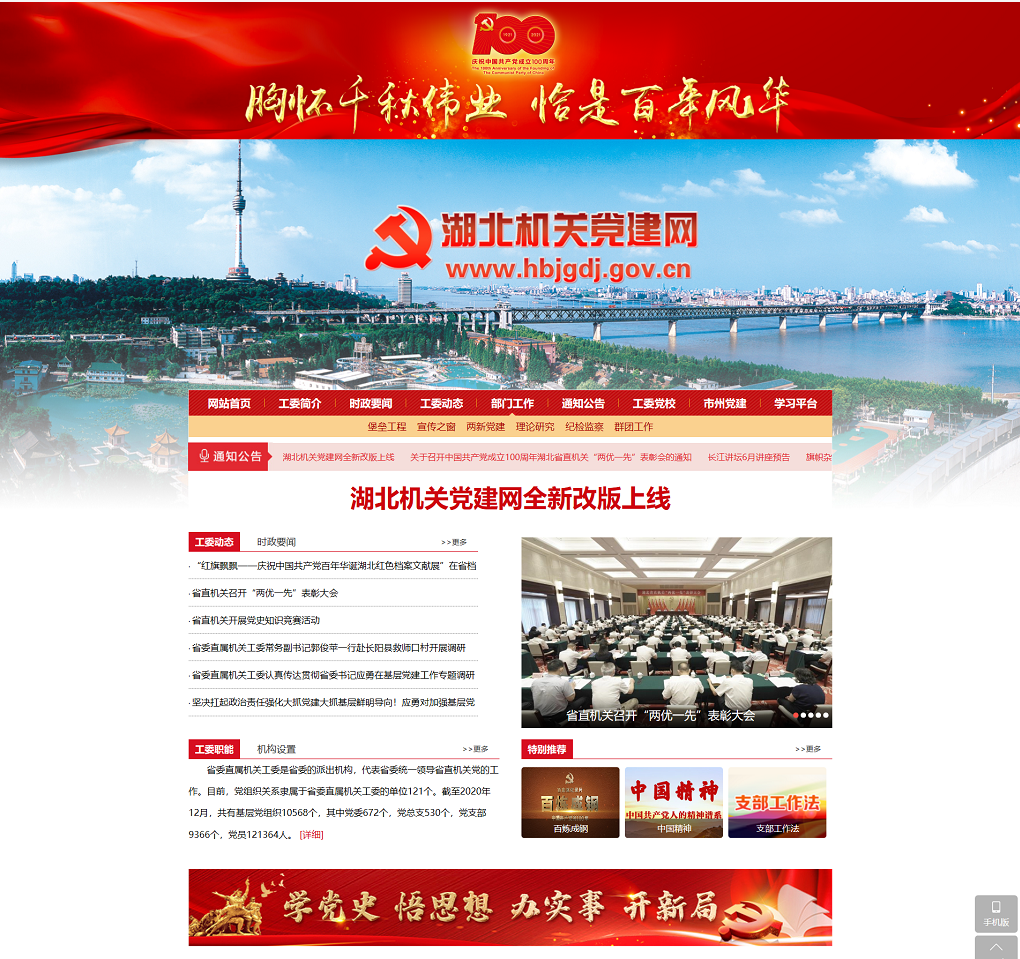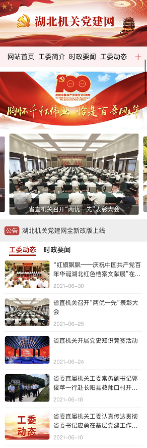 荊楚網(wǎng)(湖北日報網(wǎng))訊(記者謝頤 通訊員鄭羽嬋)在中國共產(chǎn)黨成立100周年之際,湖北機關黨建門戶網(wǎng)站湖北機關黨建網(wǎng)(http://www.hbjgdj.gov.cn/)電腦端、移動端全新改版上線。這是省委直屬機關工委積極探索智慧黨建的有效途徑,是加強省直機關黨建宣傳工作的重要舉措,是為黨慶生、為黨祝福獻上的特殊禮物。