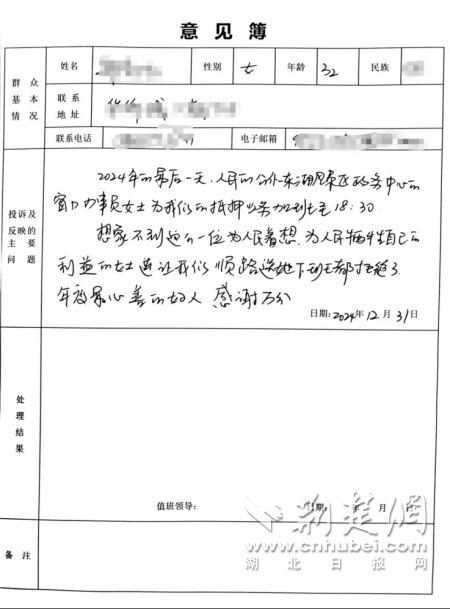 面對如此高效而貼心的服務,鄭女士深受感動。她在意見簿上情不自禁地寫道:“人民公仆……為人民著想……年度最心善的好人,感謝萬分!”簡短的文字凝聚了鄭女士對東湖不動產(chǎn)登記窗口工作人員的深深敬意和感激之情。