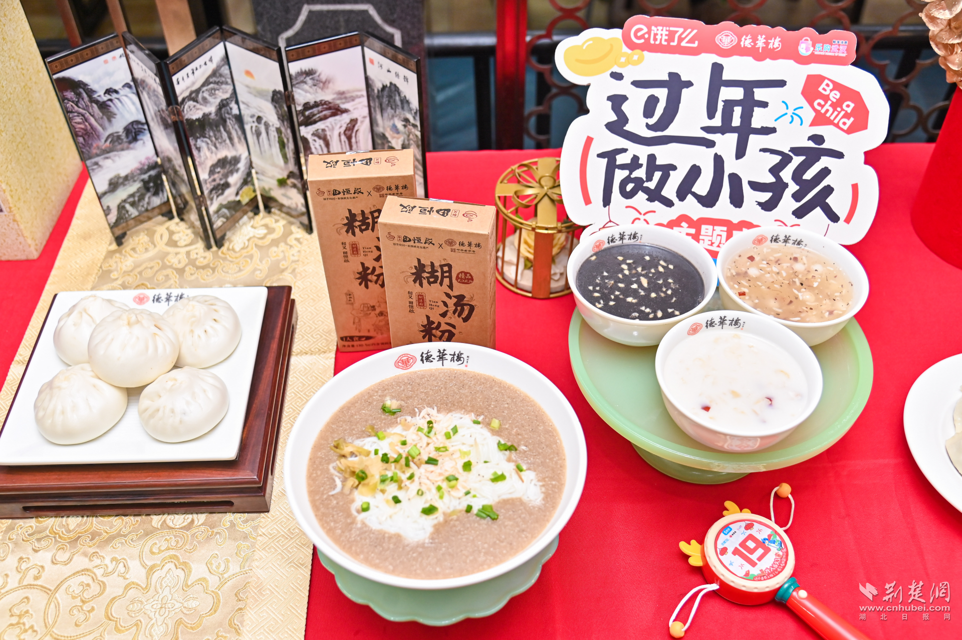 當(dāng)天,德華樓六渡橋店變身年貨快閃店,門口大鐵鍋現(xiàn)炸的熱氣騰騰的肉圓子,一字排開的水磨年糕、餃子等,以及排著長隊打年貨的武漢市民,讓武漢新春濃度再加碼。走近店內(nèi),仿佛回到童年。地板上跳格子的地貼,喚醒了與童年小伙伴在街巷里份跳格子的好時光,呼應(yīng)著墻面上以“不想長大”各種趣味招貼畫,讓人備加想念童年的滋味和年味。