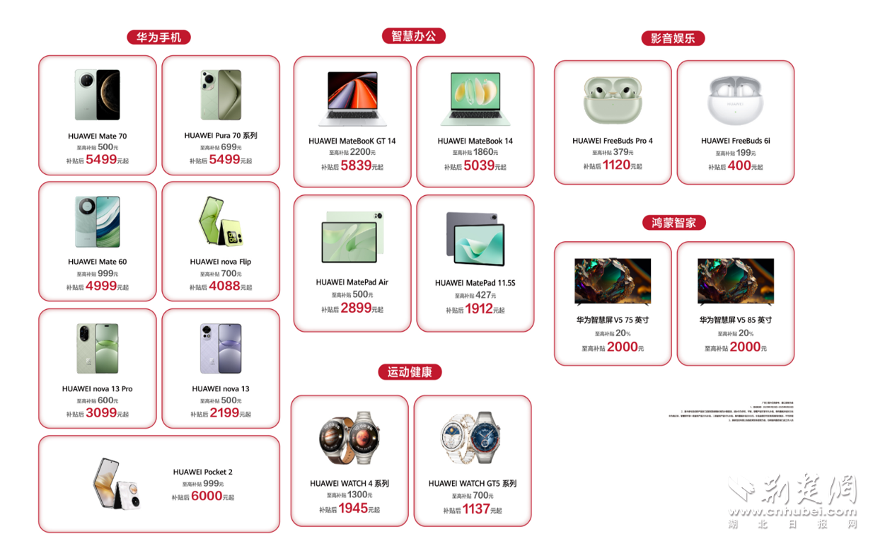 荊楚網(wǎng)(湖北日?qǐng)?bào)網(wǎng))訊 (通訊員 高洋)2025年1月20日,“國(guó)補(bǔ)”政策首次擴(kuò)圍至消費(fèi)電子行業(yè)。對(duì)個(gè)人消費(fèi)者購(gòu)買華為手機(jī)、平板、智能手表手環(huán)等3類數(shù)碼產(chǎn)品(單件銷售價(jià)格不超過6000元),按產(chǎn)品銷售價(jià)格的15%給予補(bǔ)貼,每位消費(fèi)者每類產(chǎn)品可補(bǔ)貼1件,每件補(bǔ)貼不超過500元。對(duì)于想要購(gòu)買華為手機(jī)的消費(fèi)者來(lái)說,這波優(yōu)惠力度拉滿。