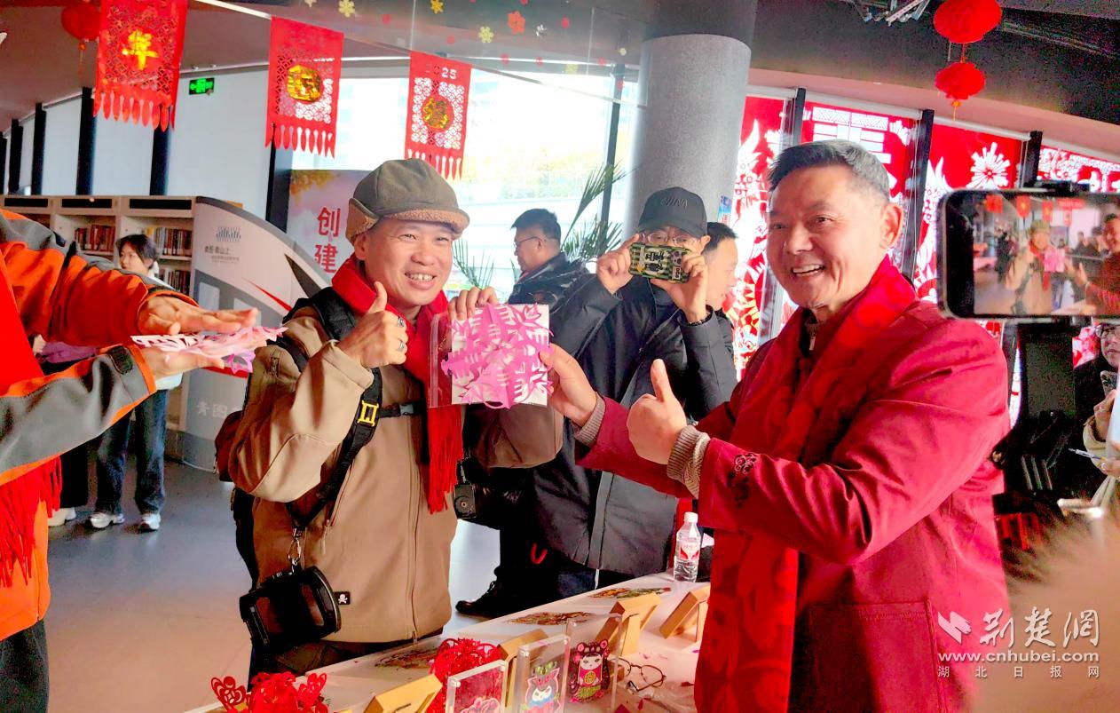 “兩岸同胞本是一家人,春節(jié)理應團圓?!被顒蝇F(xiàn)場,“武漢剪紙”省級傳承人、武漢2025“非遺賀新春”地鐵專列設計主要創(chuàng)作者沈松柏的剪紙臺前備受臺胞青睞,他一邊細心指導臺胞剪紙,一邊介紹剪紙是人們對美好生活的向往與追求。剪刀開合間,他也將祝福凝于作品,祈愿兩岸同胞身體康健、萬事勝意、新春喜樂。