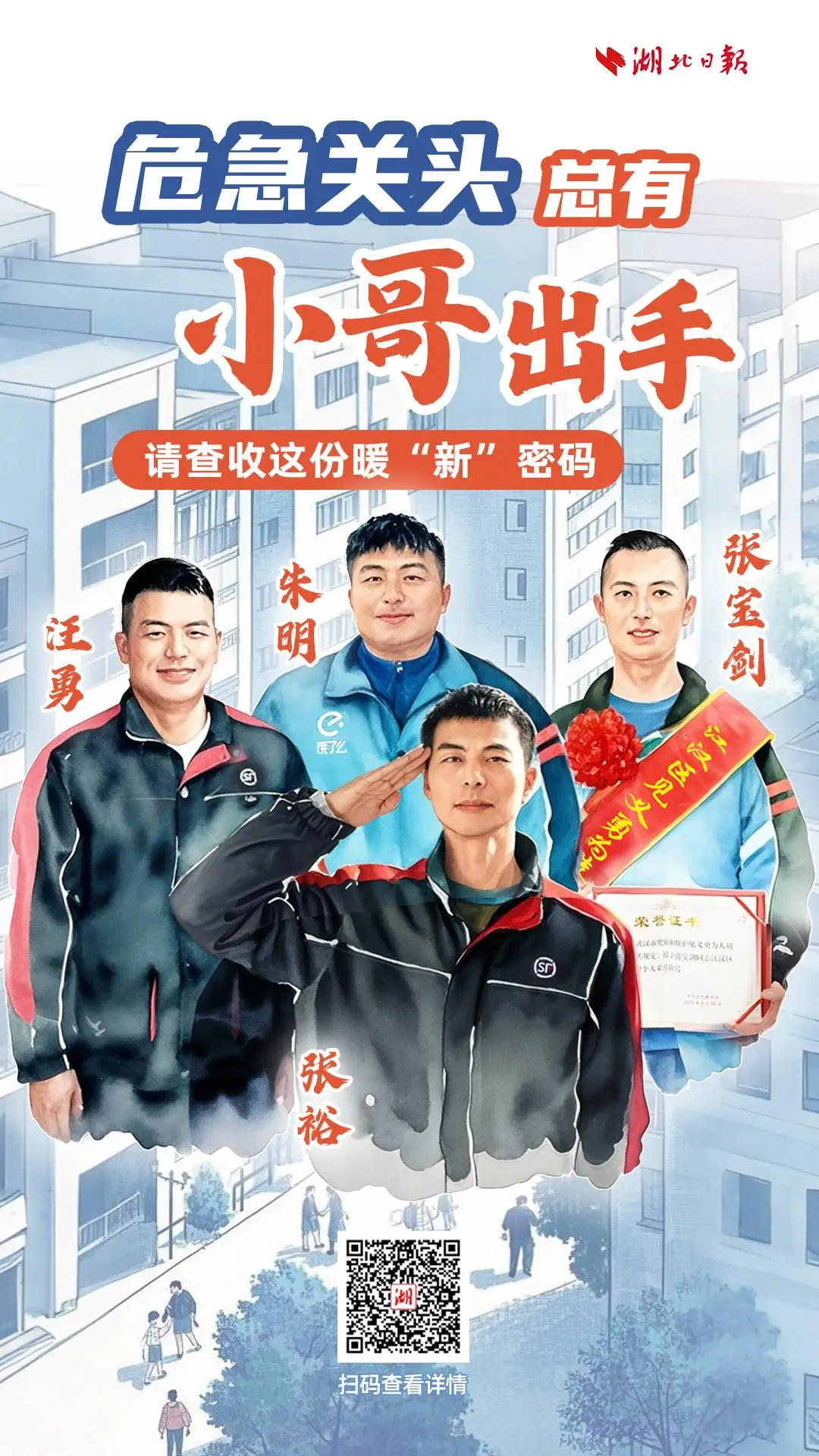 近些年來(lái),人們發(fā)現(xiàn),這個(gè)群體不僅是物流網(wǎng)絡(luò)的末梢神經(jīng),更成為群眾安危的守護(hù)者。很多人都知道這些故事:杭州外賣騎手彭清林12米高橋縱身躍江救人,溫州快遞員羅天友救人之后悄然離開,無(wú)錫李鯤鵬憑借職業(yè)敏感識(shí)破詐騙包裹。很多人也熟悉武漢的這些名字:“最美快遞員”汪勇,“火場(chǎng)英雄”順豐小哥張?jiān)#瑤ьI(lǐng)居民撲火的騎手朱明,用攜帶的自動(dòng)體外除顫器開啟緊急救人的張寶劍。