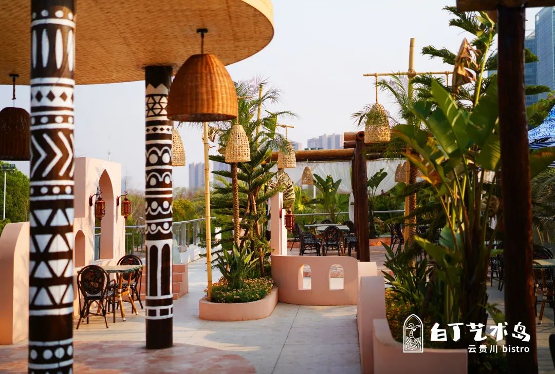白丁藝術(shù)島坐落于武漢國(guó)際體育文化休閑園內(nèi),總占地面積近4000m2。踏進(jìn)這座蘊(yùn)含東南亞風(fēng)情的神秘小島,組合式藝術(shù)空間藏在繁茂的熱帶植物中,近200米長(zhǎng)的生態(tài)水系蜿蜒貫穿,法式南洋風(fēng)情藝術(shù)空間群由連廊貫通,筆直的中東海藻、加那利海棗高大挺拔。