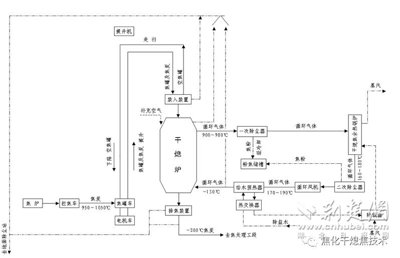 干熄焦,相對(duì)濕熄焦而言,是指采用惰性氣體將紅焦降溫冷卻的一種熄焦方法。在干熄焦過(guò)程中,紅焦從干熄爐頂部裝入,低溫惰性氣體由循環(huán)風(fēng)機(jī)鼓入干熄爐冷卻段紅焦層內(nèi),吸收紅焦顯熱,冷卻后的焦炭從干熄爐底部排出,從干熄爐環(huán)形煙道出來(lái)的高溫惰性氣體流經(jīng)干熄焦鍋爐進(jìn)行熱交換,鍋爐產(chǎn)生蒸汽,冷卻后的惰性氣體由循環(huán)風(fēng)機(jī)重新鼓入干熄爐,惰性氣體在封閉的系統(tǒng)內(nèi)循環(huán)使用。該技術(shù)可節(jié)約用水、減少大氣污染物排放,回收大量紅焦顯熱并產(chǎn)生中高壓蒸汽,有效提高能源利用效率及焦炭質(zhì)量,擴(kuò)大煉焦煤適應(yīng)性,降低煉鐵工序能耗,最終實(shí)現(xiàn)企業(yè)的節(jié)能減排。