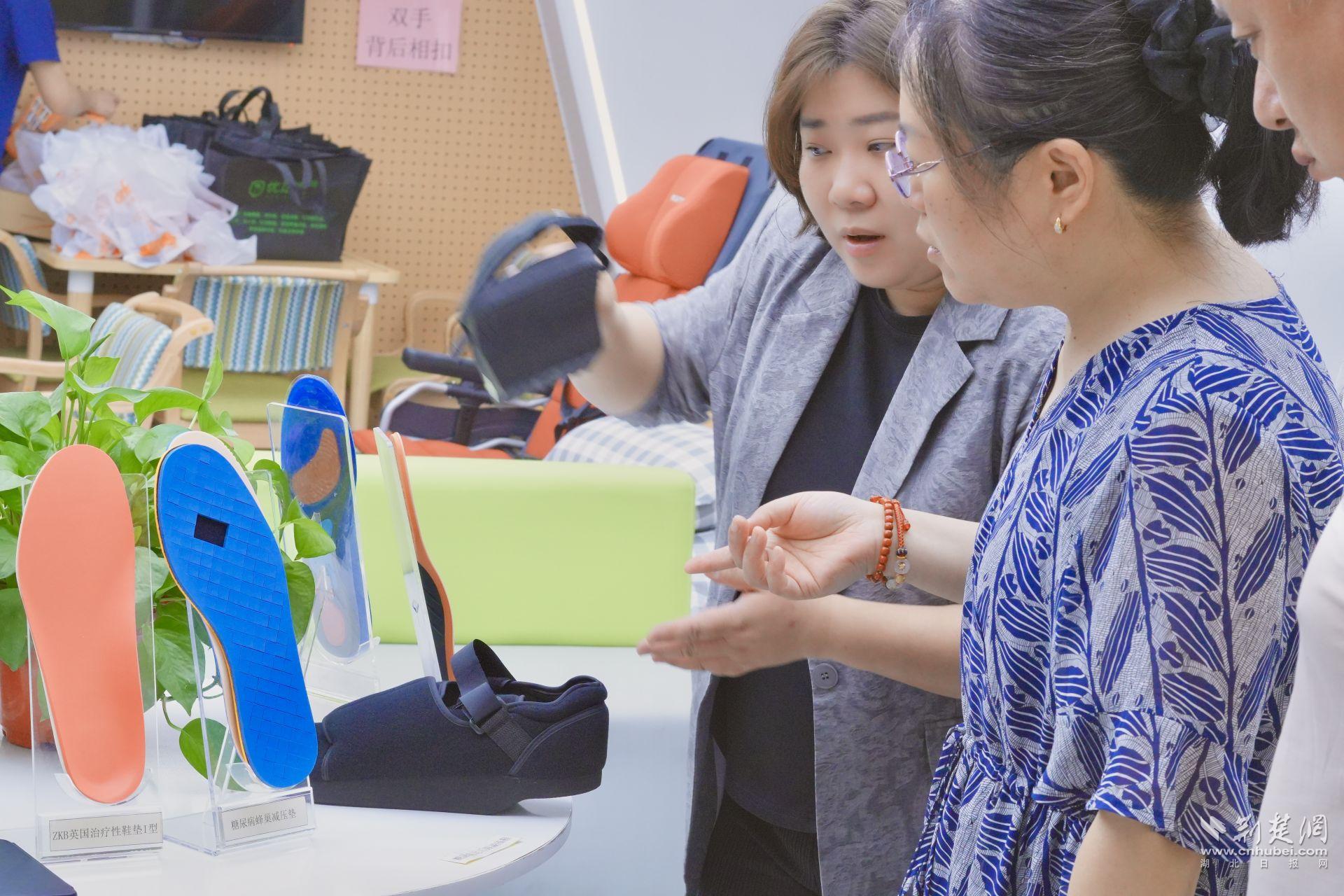 一側(cè)展區(qū)則擺放著各類康復(fù)輔具,吸引了不少居民駐足體驗。防跟裂襪、減壓鞋墊、艾草健康鞋、足底按摩球……這些看似日常小物,實則是糖尿病足管理中不可或缺的“隱形衛(wèi)士”。