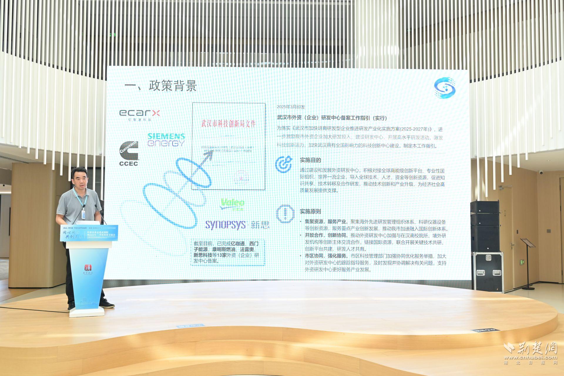 活動(dòng)上,武漢市投促局副局長(zhǎng)隋鵬發(fā)表致辭,推介武漢外資發(fā)展情況,傳遞了武漢堅(jiān)定不移優(yōu)化營(yíng)商環(huán)境、支持外資企業(yè)發(fā)展的決心與誠(chéng)意。中國(guó)人民銀行湖北省分行介紹了武漢市“科匯通”試點(diǎn)業(yè)務(wù),武漢作為“科匯通”16個(gè)試點(diǎn)城市之一,為科研資金跨境調(diào)撥提供“綠色通道”,推動(dòng)創(chuàng)新要素跨境流通。市科技創(chuàng)新局圍繞武漢科技研發(fā)政策進(jìn)行詳細(xì)解讀,激勵(lì)引導(dǎo)外資企業(yè)逐高向新,開展高水平研發(fā)活動(dòng)。武創(chuàng)院介紹了機(jī)構(gòu)運(yùn)行情況,表示將以創(chuàng)新體系建設(shè)為抓手,以市場(chǎng)化機(jī)制為手段,探索多元化成果轉(zhuǎn)化創(chuàng)新舉措,集聚“政產(chǎn)學(xué)研金服用”各類要素資源,營(yíng)造“熱帶雨林式”成果轉(zhuǎn)化創(chuàng)新生態(tài)。武漢東湖高新區(qū)同步進(jìn)行了招商推介,展現(xiàn)了中國(guó)光谷科技創(chuàng)新硬實(shí)力。·