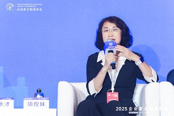 圖為阿里巴巴集團副總裁項煌妹8月3日上午在2025企業(yè)家太陽島年會主論壇思客對話環(huán)節(jié)進行發(fā)言。