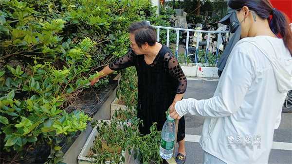 彭劉楊路社區(qū)網(wǎng)格員帶領(lǐng)居民清理積水容器。 通訊員供圖