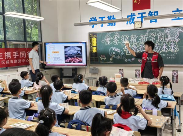荊楚網(wǎng)(湖北日?qǐng)?bào)網(wǎng))訊(通訊員 陳博龍)為進(jìn)一步增強(qiáng)青少年毒品防范意識(shí),筑牢校園禁毒安全防線,9月8日,在武昌區(qū)禁毒辦的指導(dǎo)下,積玉橋街道聯(lián)合轄區(qū)派出所、社區(qū)戒毒康復(fù)中心及金都藍(lán)灣社區(qū),共同走進(jìn)中華路小學(xué)金都校區(qū),開(kāi)展以“禁毒護(hù)航新學(xué)期、青春無(wú)毒向未來(lái)”為主題禁毒教育課堂,通過(guò)“宣講+課件+互動(dòng)+宣誓”的豐富形式,為新學(xué)期校園安全增添“防毒屏障”。