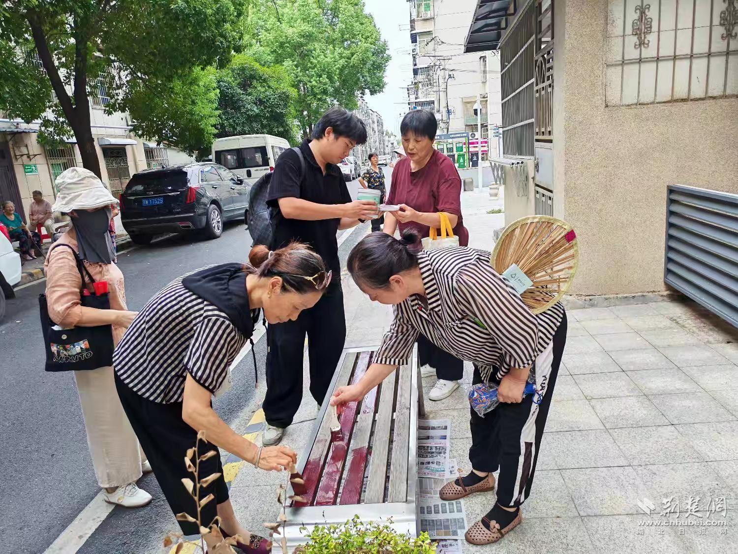 隨后,居民們?cè)诙綄?dǎo)員和社區(qū)工作人員帶領(lǐng)下走進(jìn)19棟小廣場(chǎng),開(kāi)展“睦鄰花廊”老舊桌椅翻新環(huán)節(jié)。大家齊心協(xié)力,刷漆、上色,讓11張因風(fēng)雨侵蝕而斑駁的休閑長(zhǎng)椅煥然一新——其中3張漆成老紅色,8張披上繽紛彩裝。一個(gè)多小時(shí)后,廣場(chǎng)煥發(fā)新貌,成為居民休閑的新亮點(diǎn)。