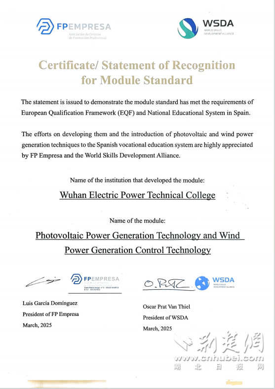 荊楚網(wǎng)(湖北日?qǐng)?bào)網(wǎng))訊(通訊員 陳書雨)當(dāng)前全球能源結(jié)構(gòu)加速向可再生能源轉(zhuǎn)型,跨國(guó)技術(shù)協(xié)作與職業(yè)教育標(biāo)準(zhǔn)互通,已成為推動(dòng)能源產(chǎn)業(yè)高質(zhì)量發(fā)展的關(guān)鍵紐帶。9月26日,國(guó)網(wǎng)湖北技培中心(武漢電院)(以下簡(jiǎn)稱“技培(電院)”)“西班牙國(guó)家課程標(biāo)準(zhǔn)及數(shù)字化課程開發(fā)項(xiàng)目”關(guān)鍵節(jié)點(diǎn)落地,成功完成《光伏發(fā)電技術(shù)》《風(fēng)力發(fā)電控制技術(shù)》兩門課程跨國(guó)培訓(xùn)直播,這一里程碑事件標(biāo)志著技培(電院)自主研發(fā)的兩門課程標(biāo)準(zhǔn)正式輸出西班牙,為中西能源職教合作搭建起全新橋梁。