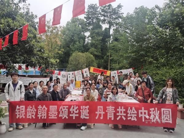 黨課結(jié)束后,長(zhǎng)者與志愿者們攜手投入到藝術(shù)創(chuàng)作中。有人揮毫潑墨,以蒼勁有力的筆觸勾勒出祖國的大好河山,展現(xiàn)對(duì)祖國的熱愛與贊美;有人奮筆疾書,將“銘記歷史”“吾輩自強(qiáng)”等抗戰(zhàn)主題字句工整地落于紙上,墨香間滿是跨越代際的紅色情懷。兩代人一邊創(chuàng)作,一邊暢聊過往的中秋記憶與見證的祖國變遷,情感在筆墨間悄然流淌。