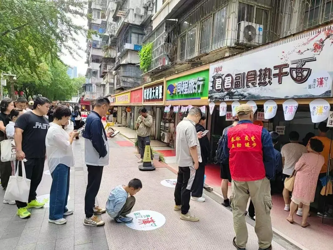 國(guó)慶中秋假期,江漢區(qū)游客量激增,君君副食的隊(duì)伍從店門口蜿蜒著排出數(shù)十米。社區(qū)志愿者舉著醒目的提示牌引導(dǎo)停車,網(wǎng)格員把路邊的共享單車統(tǒng)一移走,引導(dǎo)著慕名而來(lái)的食客井然有序地排隊(duì)等候?!耙郧耙坏焦?jié)假日就發(fā)愁,客人擠得轉(zhuǎn)不開身,現(xiàn)在有專人維持秩序,生意反而更穩(wěn)當(dāng)了。”店主余阿姨擦著額頭的汗笑言。