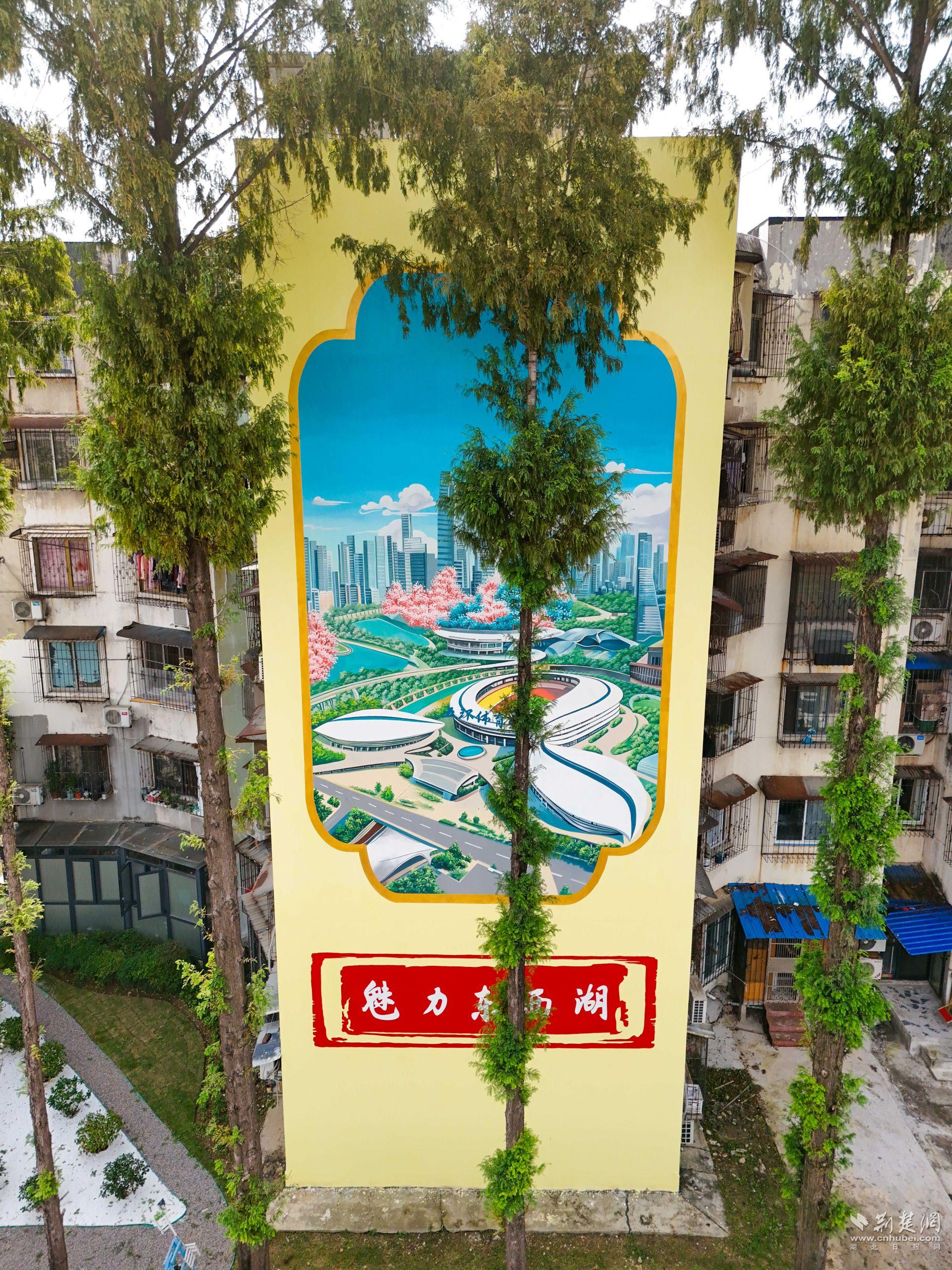 圍墻和彩繪也成了亮點。專業(yè)團隊在相鄰居民樓外墻繪制325平方米主題壁畫——一面呈現(xiàn)“魅力東西湖”的城市風貌,一面展現(xiàn)“幸福新常青”的生活圖景,成為社區(qū)新地標。