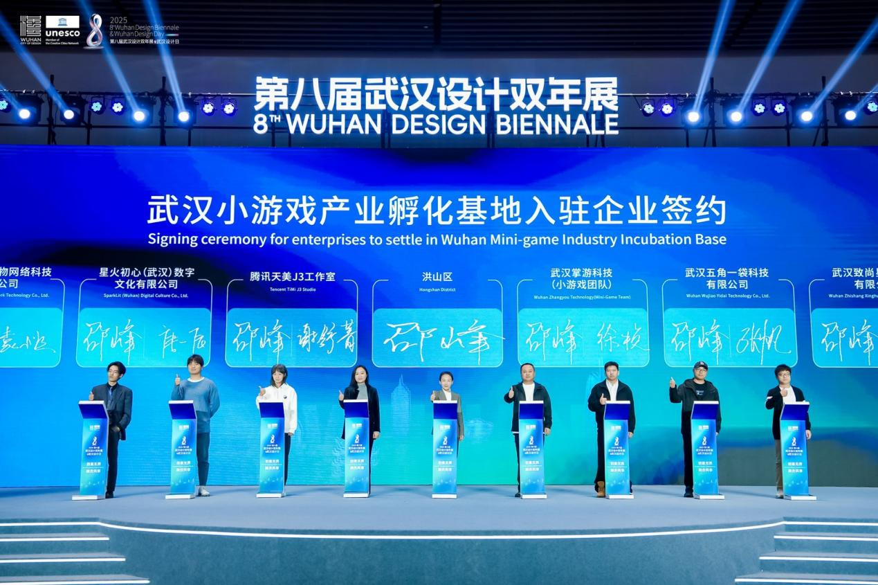 榮譽(yù)之外,產(chǎn)業(yè)合作是設(shè)計(jì)價(jià)值轉(zhuǎn)化的關(guān)鍵。開幕式現(xiàn)場,8家企業(yè)簽約入駐全國首家小游戲產(chǎn)業(yè)孵化基地——“武漢市小游戲產(chǎn)業(yè)孵化基地”,他們中既有充滿朝氣的新生代小游戲團(tuán)隊(duì),也有掌游科技這樣的行業(yè)領(lǐng)軍者,更有騰訊天美J3工作室等頂尖力量,他們將攜手打破行業(yè)邊界、共享資源平臺,共同推動數(shù)字創(chuàng)意產(chǎn)業(yè)與設(shè)計(jì)融合發(fā)展。