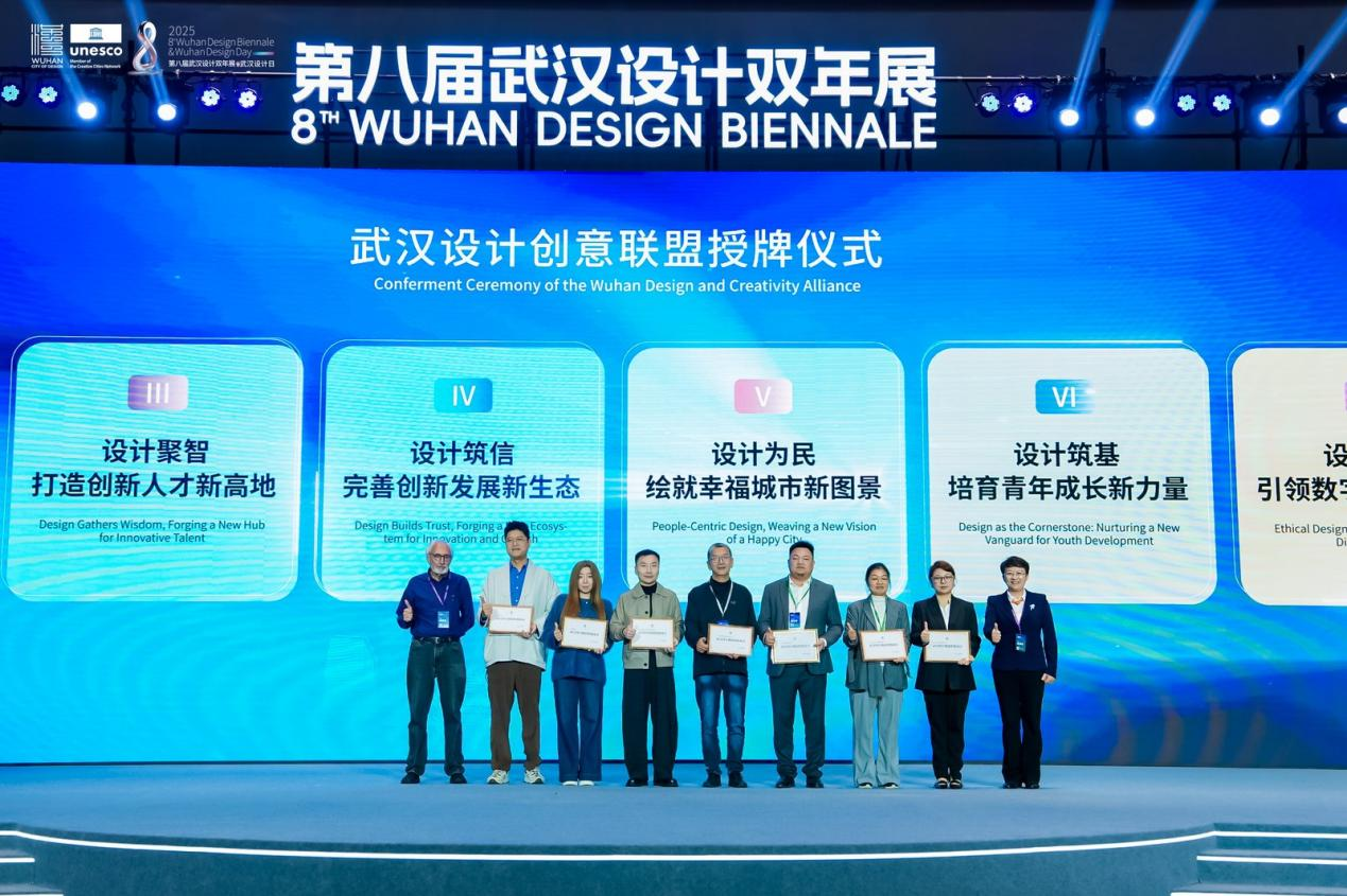 武漢有設(shè)計(jì)相關(guān)專業(yè)高校50余所,設(shè)計(jì)專業(yè)在校學(xué)生近10萬人,設(shè)計(jì)相關(guān)企業(yè)突破1萬家,10余個(gè)設(shè)計(jì)行業(yè)協(xié)會,從業(yè)人員超50萬,形成了強(qiáng)大的“設(shè)計(jì)創(chuàng)意聯(lián)盟”,催生出了集產(chǎn)業(yè)鏈、創(chuàng)新鏈、人才鏈、價(jià)值鏈于一體的融合創(chuàng)新發(fā)展生態(tài)體系。在開幕式的最后,“武漢設(shè)計(jì)創(chuàng)意聯(lián)盟”正式授牌,來自設(shè)計(jì)企業(yè)、行業(yè)協(xié)會、高校院所和獨(dú)立設(shè)計(jì)師等領(lǐng)域多元設(shè)計(jì)力量代表共同見證。未來,“武漢設(shè)計(jì)創(chuàng)意聯(lián)盟”將奮力實(shí)現(xiàn)設(shè)計(jì)融城,構(gòu)筑協(xié)同發(fā)展新范式;設(shè)計(jì)賦能,激活產(chǎn)業(yè)升級新動能;設(shè)計(jì)聚智,打造創(chuàng)新人才新高地;設(shè)計(jì)筑信,完善創(chuàng)新發(fā)展新生態(tài);設(shè)計(jì)為民,繪就幸福城市新圖景;設(shè)計(jì)筑基,培育青年成長新力量;設(shè)計(jì)向善,引領(lǐng)數(shù)字文明新航向;設(shè)計(jì)聯(lián)通,拓展國際交往新空間八大目標(biāo)。