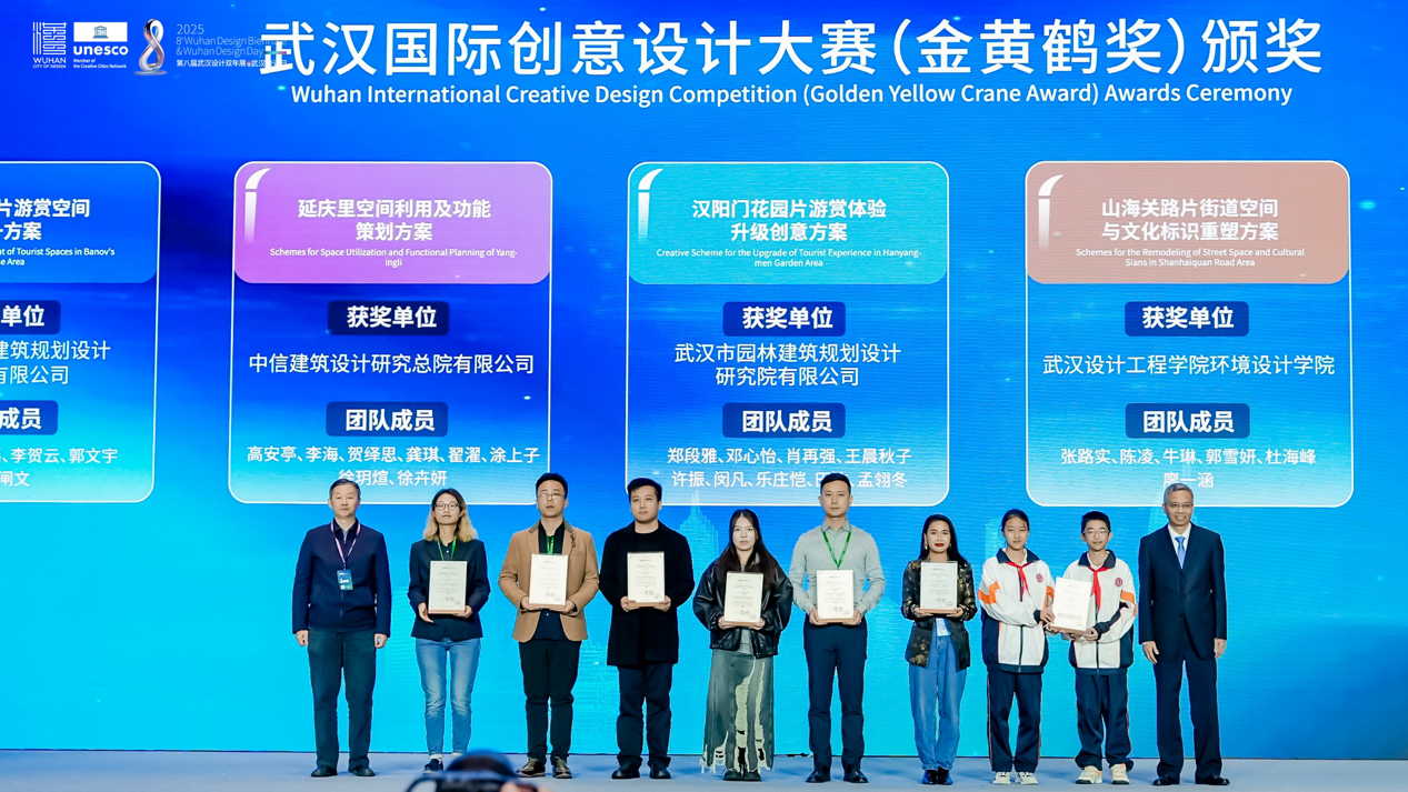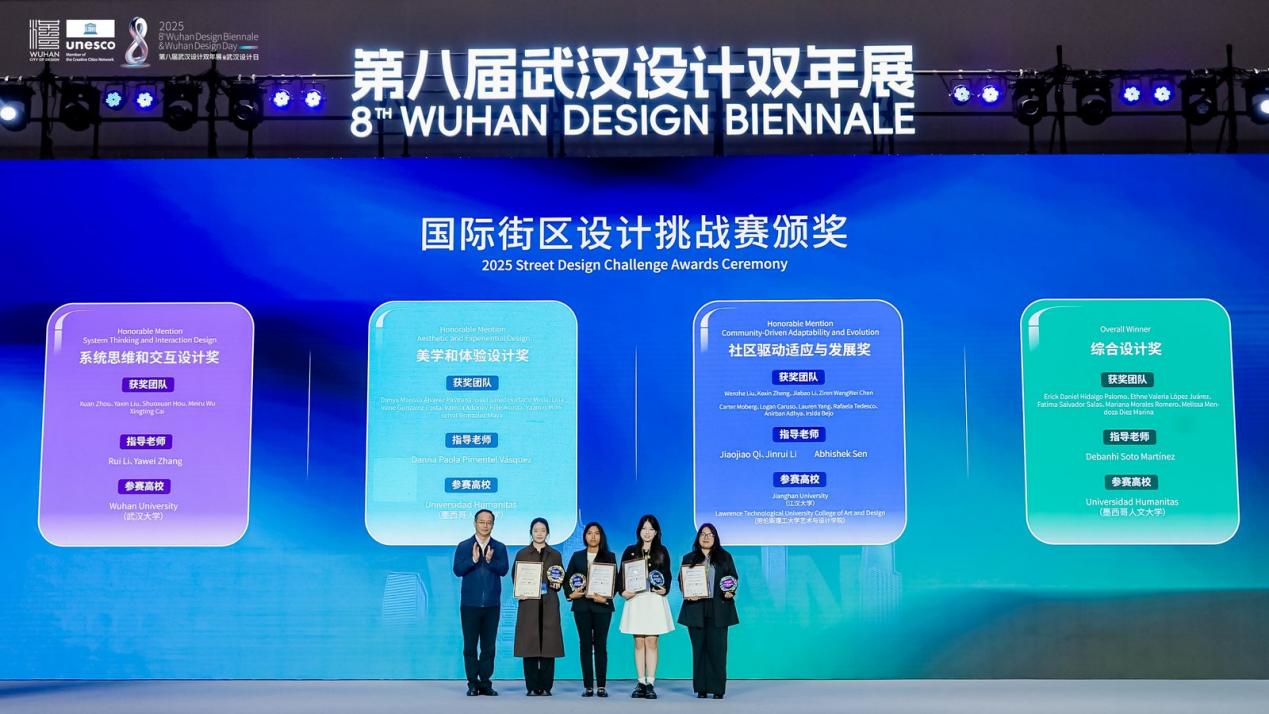 開幕式上,2025年武漢國際創(chuàng)意設(shè)計(jì)大賽(金黃鶴獎)與 2025年國際街區(qū)挑戰(zhàn)賽頒獎儀式同步舉行。其中,象征武漢設(shè)計(jì)創(chuàng)新探索的“金黃鶴獎”,今年特意選取黃鶴樓、山海關(guān)路、漢陽門等市民常去、關(guān)注度高、滿滿煙火氣的城市地標(biāo)作為設(shè)計(jì)對象,不限專業(yè)和地域,征集更宜人的更新提升方案。現(xiàn)場,武漢瑞拓建筑設(shè)計(jì)咨詢有限公司等6個(gè)專業(yè)組一等獎和最佳組織獎武漢市七一華源中學(xué)等獲獎代表接受頒獎。國際街區(qū)挑戰(zhàn)賽,則是由聯(lián)合國教科文組織設(shè)計(jì)之都城市聯(lián)合舉辦,全球高校團(tuán)隊(duì)共同參與的國際設(shè)計(jì)賽事。經(jīng)過全球30位權(quán)威專家1個(gè)月的精心細(xì)致評審,選出了四個(gè)優(yōu)勝方案?,F(xiàn)場,為交互設(shè)計(jì)獎獲獎團(tuán)隊(duì)武漢大學(xué)、美學(xué)設(shè)計(jì)獎獲獎團(tuán)隊(duì)墨西哥人文大學(xué)、社區(qū)發(fā)展獎獲獎團(tuán)隊(duì)江漢大學(xué)團(tuán)隊(duì)和美國勞倫斯理工大學(xué)團(tuán)隊(duì),以及綜合設(shè)計(jì)獎獲獎團(tuán)隊(duì)墨西哥人文大學(xué)頒獎。