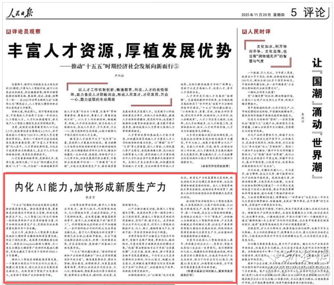 荊楚網(wǎng)(湖北日?qǐng)?bào)網(wǎng))訊(通訊員 杜軒)11月20日,百度創(chuàng)始人、董事長(zhǎng)兼首席執(zhí)行官李彥宏在《人民日?qǐng)?bào)》發(fā)表題為《內(nèi)化AI能力,加快形成新質(zhì)生產(chǎn)力》的署名文章。他指出,推動(dòng)人工智能更好賦能高質(zhì)量發(fā)展,一個(gè)重要方面是讓千行百業(yè)內(nèi)化AI能力,構(gòu)建AI原生能力,使之成為企業(yè)發(fā)展的原生推動(dòng)力。