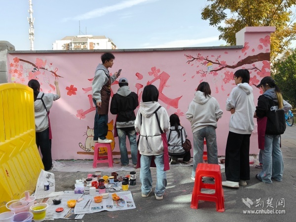 活動(dòng)首日,志愿者們?cè)缭鐏?lái)到現(xiàn)場(chǎng),分工協(xié)作完成物料搬運(yùn)、防護(hù)鋪設(shè)等準(zhǔn)備工作。隨著畫(huà)筆起落,原本單調(diào)的灰墻被溫柔的粉色調(diào)漸漸覆蓋,“武漢”兩個(gè)大字輪廓清晰浮現(xiàn),兩側(cè)櫻花枝椏初現(xiàn)雛形。在冬日的暖陽(yáng)下,志愿者們俯身勾勒、抬手描繪,讓冰冷墻面開(kāi)始煥發(fā)浪漫生機(jī)。