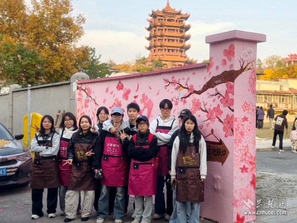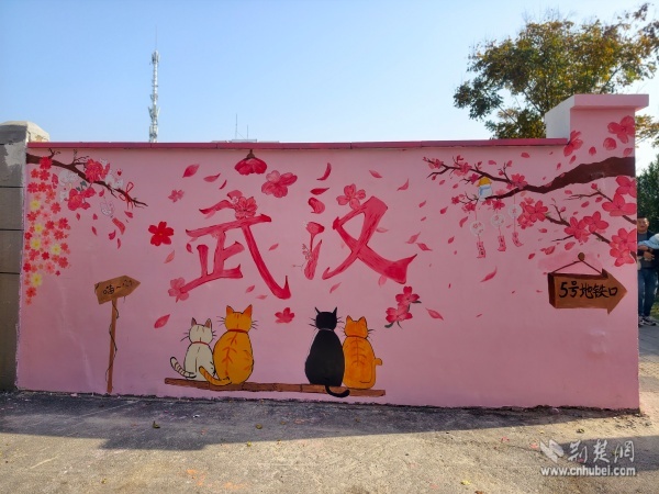 次日,創(chuàng)作進(jìn)入精修階段。志愿者們細(xì)致調(diào)整“武漢”字樣的色彩飽和度,用粉白顏料層層暈染出飛揚(yáng)的櫻花花瓣。四只形態(tài)各異的貓咪相依蹲坐,靈動(dòng)可愛(ài);特意添加的“5號(hào)地鐵口”指引牌等實(shí)用元素,更讓作品兼具藝術(shù)性與功能性。創(chuàng)作過(guò)程中,不斷有居民和游客駐足觀賞,主動(dòng)詢(xún)問(wèn)設(shè)計(jì)理念。“我們想通過(guò)櫻花、貓咪等元素,展現(xiàn)武漢的浪漫與煙火氣?!敝驹刚咭贿呎{(diào)色一邊向圍觀群眾講解。