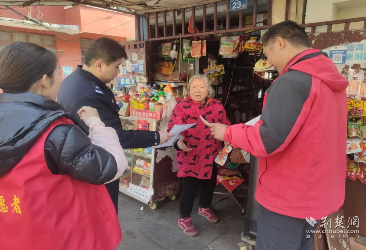社區(qū)工作人員與民警向商戶宣傳禁放煙花爆竹政策。通訊員供圖