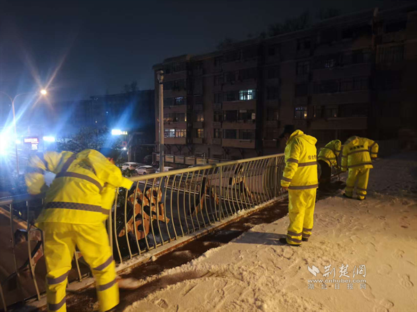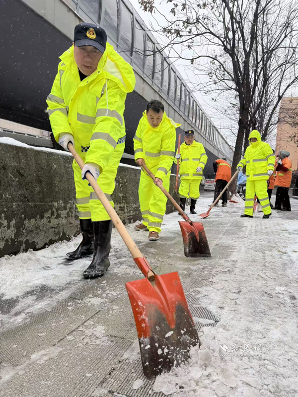 1月19日深夜至20日凌晨,隨著雪勢加大,街道應(yīng)急搶險(xiǎn)隊(duì)伍迅速化身“風(fēng)雪夜行人”,頂著嚴(yán)寒奔赴一線。他們采取機(jī)械作業(yè)與人工作業(yè)相結(jié)合的方式,對(duì)轄區(qū)主次干道、橋梁、陡坡、十字路口等重點(diǎn)路段和易結(jié)冰區(qū)域,進(jìn)行循環(huán)撒布融雪鹽和清掃作業(yè),最大限度預(yù)防道路結(jié)冰。寒夜中,隊(duì)員們衣衫被雪花浸濕,臉頰被寒風(fēng)凍紅,但無人退縮,持續(xù)堅(jiān)守。天色微明,雪勢稍歇,隊(duì)伍立即轉(zhuǎn)戰(zhàn),對(duì)背街小巷、人行道、天橋等區(qū)域的殘留積雪進(jìn)行清理,并在坡道、臺(tái)階等易滑處鋪設(shè)防滑草墊、設(shè)置警示標(biāo)識(shí),全力保障早高峰出行安全順暢。