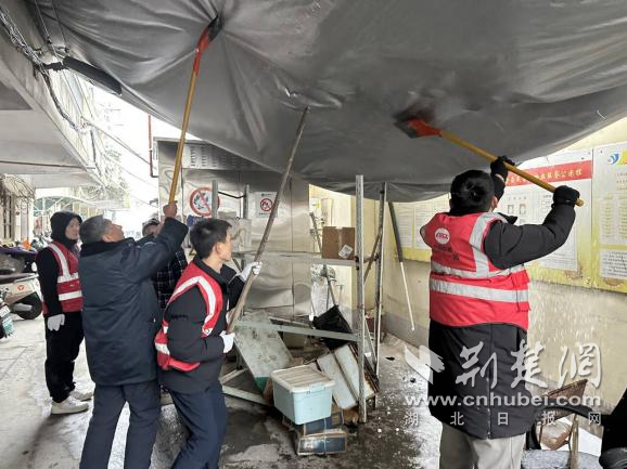 除雪過(guò)程中,工作人員發(fā)現(xiàn)一處老舊小區(qū)宿舍門前遮雨棚因積雪堆積嚴(yán)重變形,存在垮塌隱患。大家立即分工協(xié)作,有的手持長(zhǎng)桿清理棚頂積雪,有的在下方拉起警戒線、疏導(dǎo)居民通行,及時(shí)消除了高空墜物風(fēng)險(xiǎn),為居民撐起一把“安全傘”。
