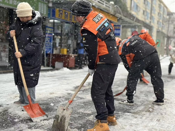 外賣小哥參與鏟雪工作。 通訊員供圖