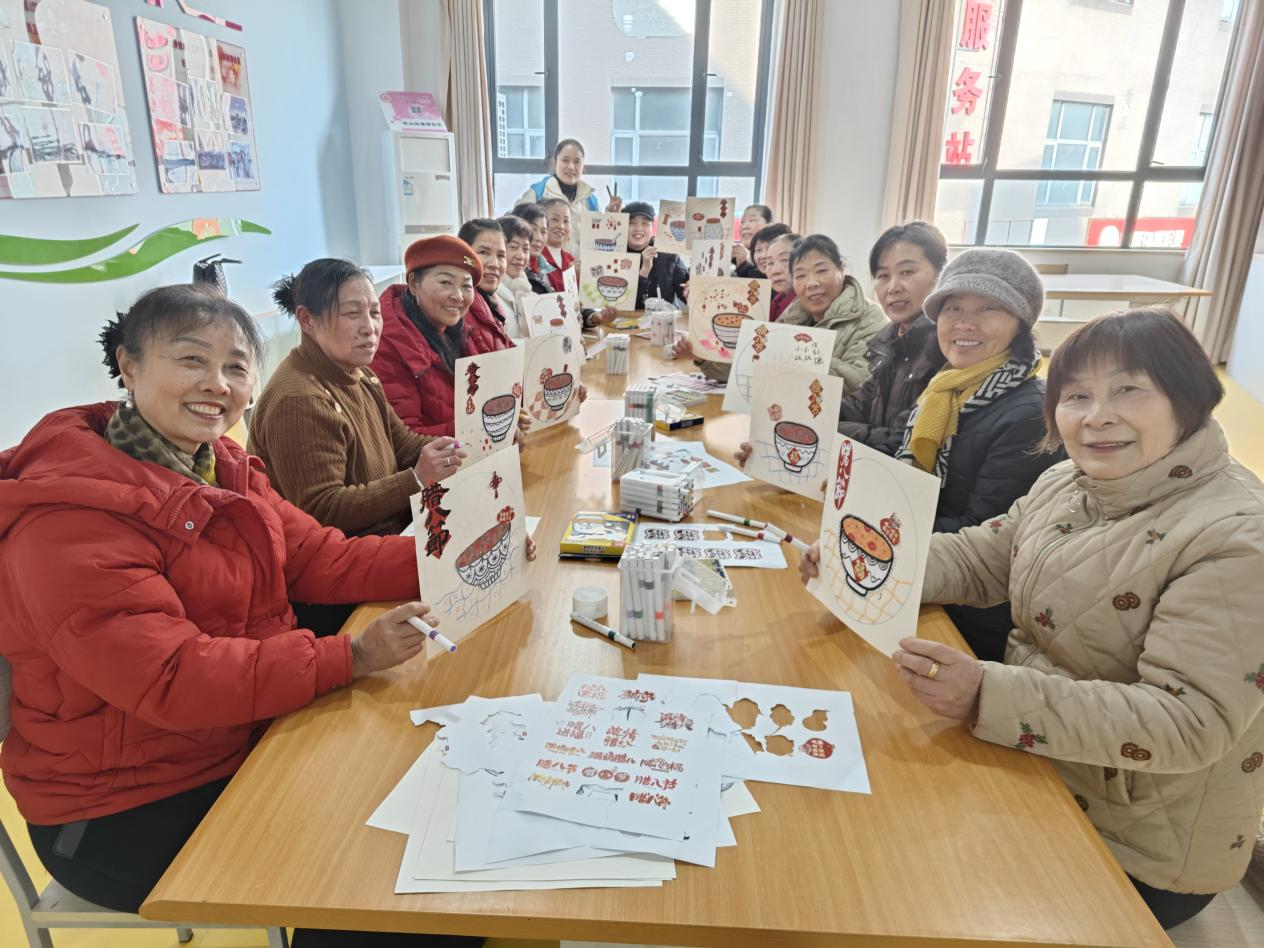社區(qū)老年人活動中心內,老人們圍坐在一起體驗“溫情臘八”手工繪畫,在創(chuàng)作中增進鄰里情誼?!昂枚嗄隂]畫過畫了,今天好像回到了年輕時候!”74歲的李庭香老人舉著自己剛完成的《臘八團圓圖》笑著說道。