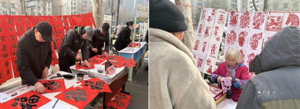 同一時(shí)間,在四美塘社區(qū),大紅的春聯(lián)紙、精致的剪紙作品與濃郁的墨香交織,勾勒出吉祥喜慶的新春圖景。武昌區(qū)社區(qū)教育學(xué)院楊園街分校的教師和學(xué)員們布置了書(shū)法創(chuàng)作區(qū)、剪紙展示區(qū),吸引眾多居民駐足觀賞。在書(shū)法創(chuàng)作區(qū),居民主動(dòng)參與書(shū)寫(xiě)體驗(yàn),在老師的指導(dǎo)下親手描繪新春祝福。在剪紙區(qū),精美的作品整齊陳列,居民們登記后即可領(lǐng)取,將這份獨(dú)特的新春祝福帶回家。