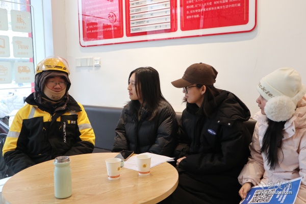 調(diào)研期間,實(shí)踐隊(duì)在街道統(tǒng)籌安排下,深入街道新就業(yè)群體服務(wù)驛站、新業(yè)態(tài)站點(diǎn)及“暖新聯(lián)盟”商家,通過(guò)實(shí)地走訪、座談交流、問(wèn)卷調(diào)研等形式,與一線騎手、站點(diǎn)負(fù)責(zé)人、社區(qū)工作者面對(duì)面溝通。他們?cè)敿?xì)了解新就業(yè)群體工作生活狀況、現(xiàn)實(shí)需求與參與基層治理意愿,重點(diǎn)調(diào)研志愿積分激勵(lì)、“五大員”培育、“黃小蜂助老送餐隊(duì)”等特色項(xiàng)目的運(yùn)行成效。街道以服務(wù)型治理搭建信任紐帶、引導(dǎo)新就業(yè)群體融入基層治理的工作模式,為高校專業(yè)研究提供了鮮活的實(shí)踐樣本。