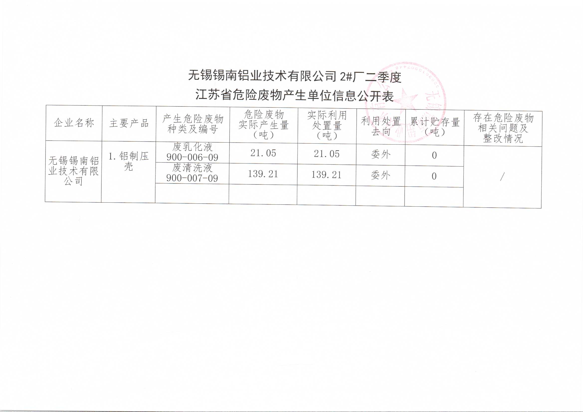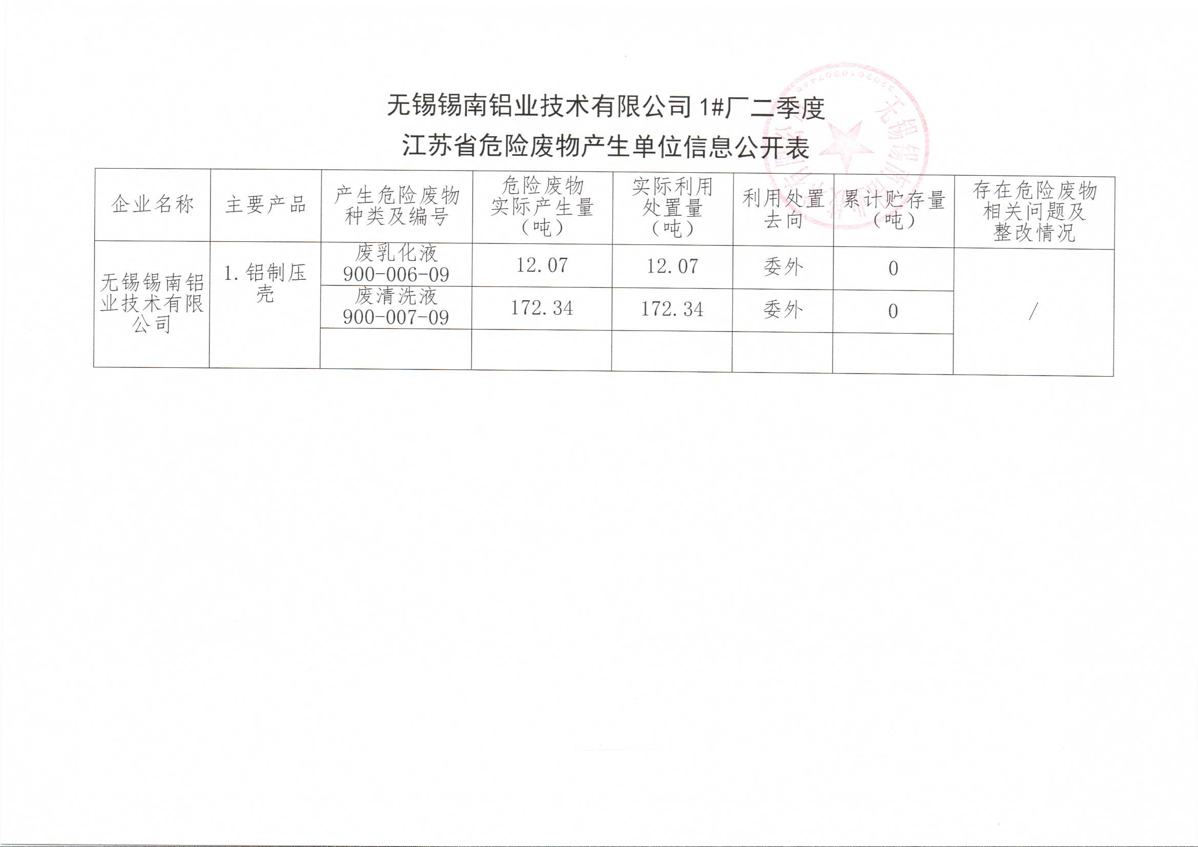 江蘇省危險廢物產(chǎn)生單位信息公開表(二季度)