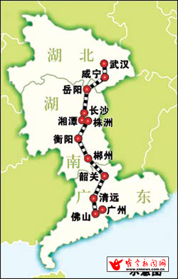 武廣高速鐵路是我國2005年開工的線路最長、投資最大的客運專線,北起武漢新火車站,途經(jīng)江夏、咸寧、岳陽、長沙、株洲、衡陽、郴州、韶關(guān)、清遠和花都,南到番禺的廣州新火車站,全長995公里,總投資約1166億元。該鐵路建設(shè)創(chuàng)造和打破了中國世界紀錄協(xié)會多項世界之最、中國之最。