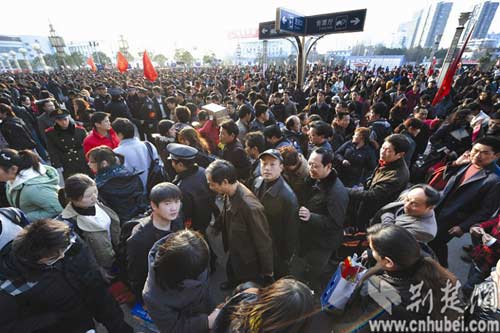 記者今天上午在武昌站采訪了值班站長,她告訴記者,去年春運(yùn),買票的隊伍成了長龍,要蜿蜒拐彎延伸到廣場上,而現(xiàn)在售票窗口前,排隊的人大多在二三十人左右。她兩相比對,感嘆還是高鐵緩解壓力。