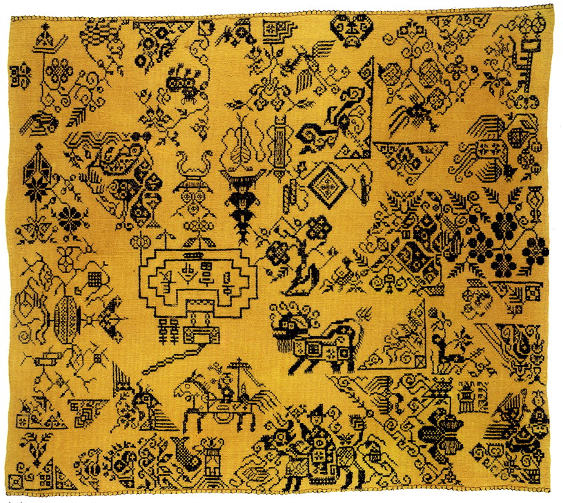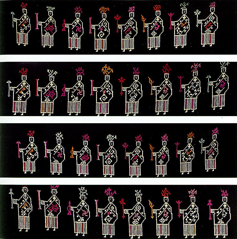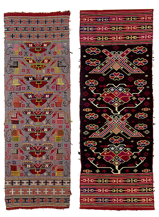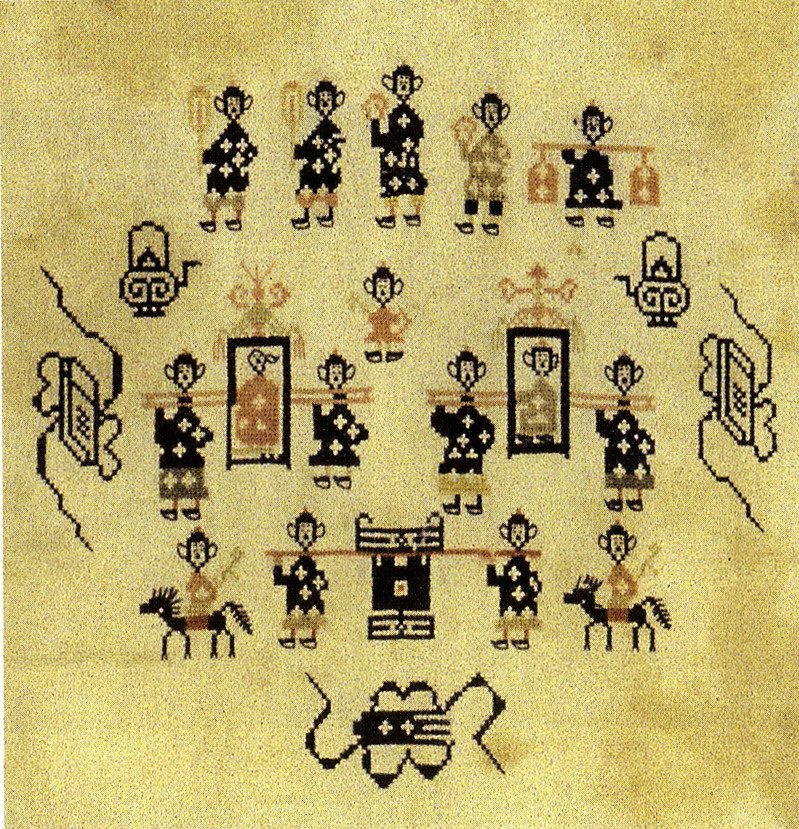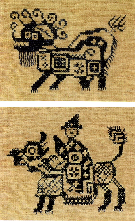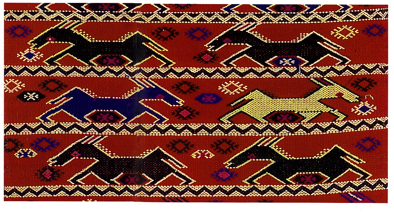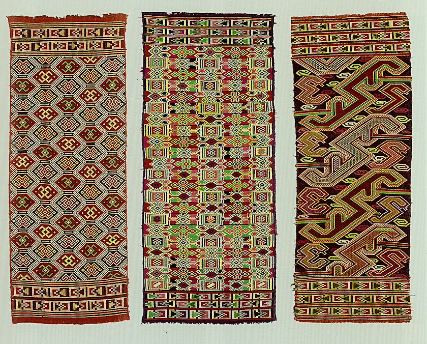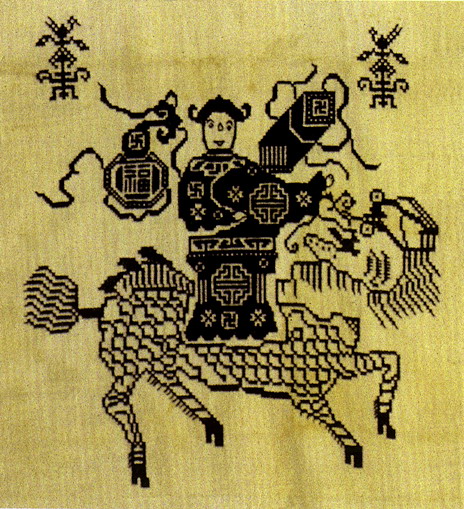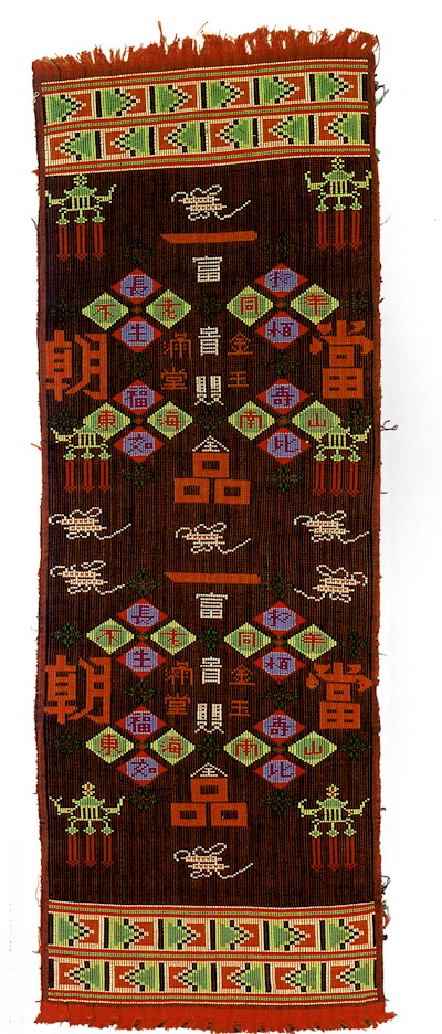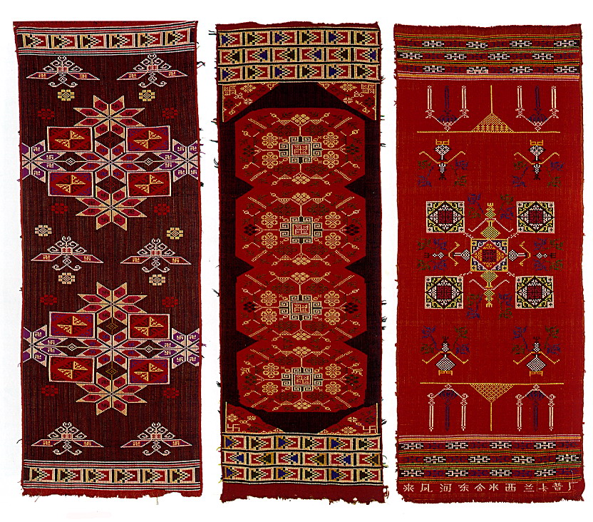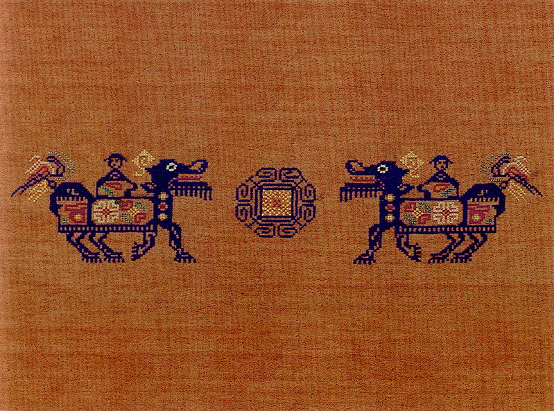 土錦以“通以斷緯”為編織手段,受巴楚文化的影響:1、紋飾既抽象又有形,土錦圖案來自對大自然的感受,身邊的物象也是編織者寄情抒懷的選擇,不論是對動物或用具,還是對天象星座,都能運(yùn)用夸張變形的手法,達(dá)到抽象裝飾美的效果。2、色彩上注重原色與復(fù)色的互補(bǔ):運(yùn)用紅、黃、藍(lán)三色,并延伸以赤、黃、青、白、黑為五正色。
