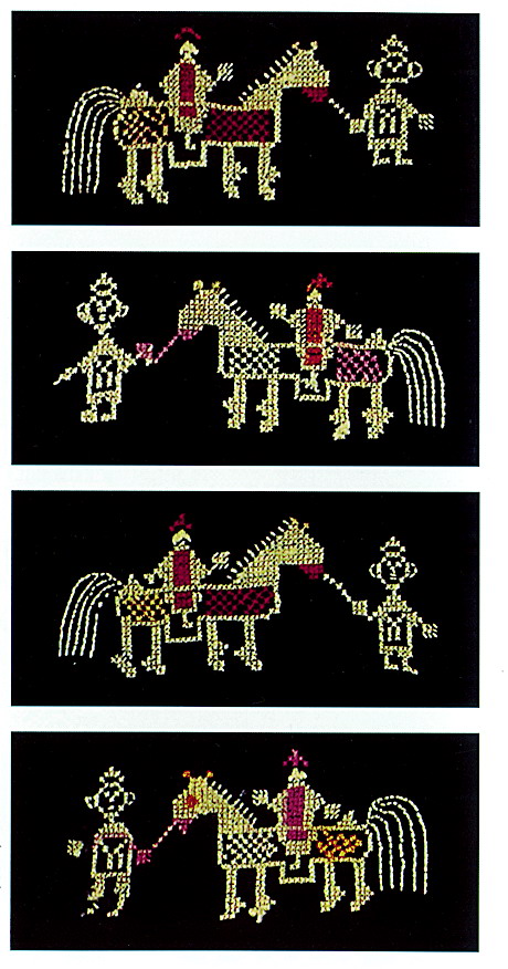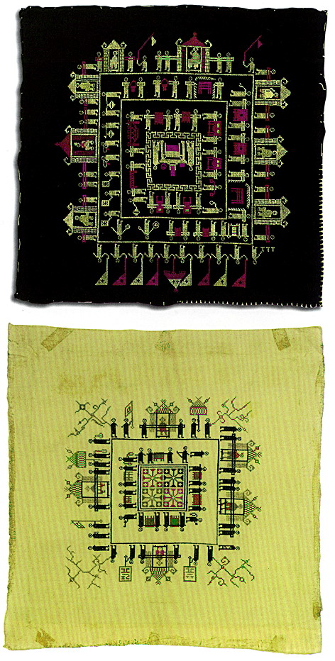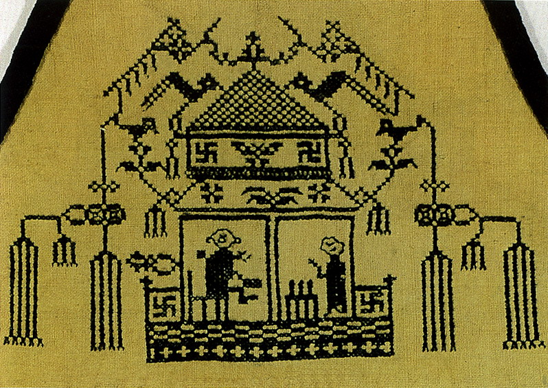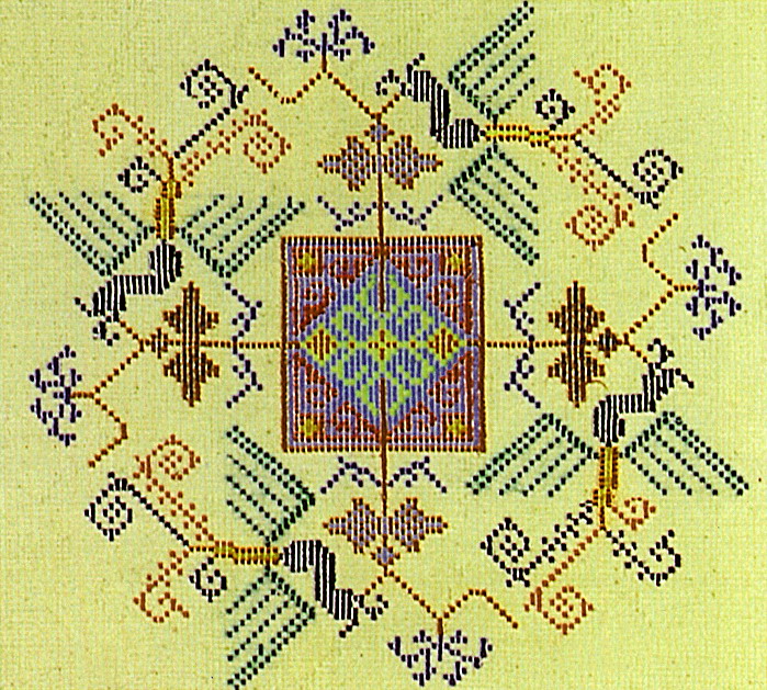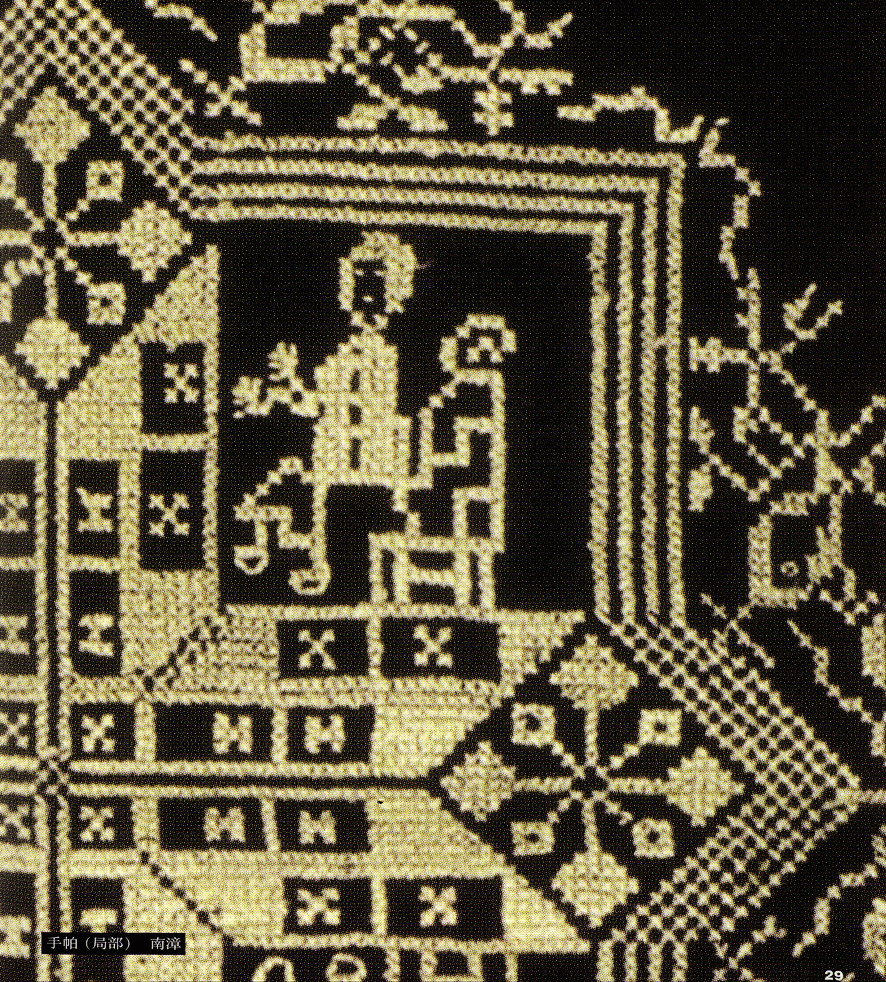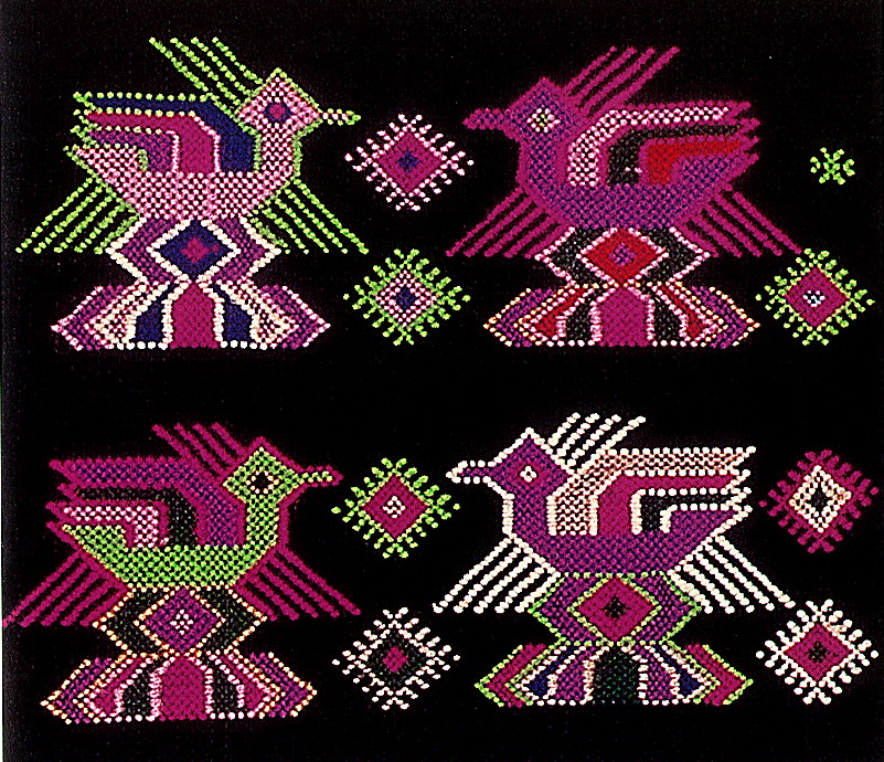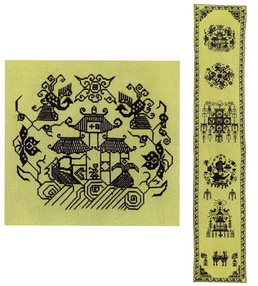 挑花針法有平挑花和十字花兩種,即在平布上面依紗眼用繡花針扣上十字形,然后以此為骨架,填置上多種需要花紋,采取反面挑花正面看手法,其優(yōu)點(diǎn)有二:一是保持清潔;二是便于打結(jié)。構(gòu)圖多是幾何圖形,也有動植物的幾何圖案。其結(jié)構(gòu)主要有對稱式、交叉式、二方連續(xù)式、斜菱形、單獨(dú)紋樣等等。圖案花紋既規(guī)整而又變化多姿,給人以舒暢愉快的感覺。
