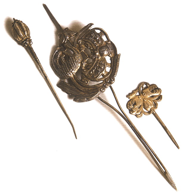 銀飾以白銀為原料,純度高,久用耐磨,不易腐蝕,光澤奪目,極顯高貴;一般為富裕人家的飾物,常有耳墜、戒指、手鐲、發(fā)簪、手鏈等。最為精彩的是帽飾人物,常用高浮雕、淺浮雕、鑲嵌和鏤空的表現(xiàn)手法,圖案多為龍鳳吉祥、長命富貴、麒麟送子等。